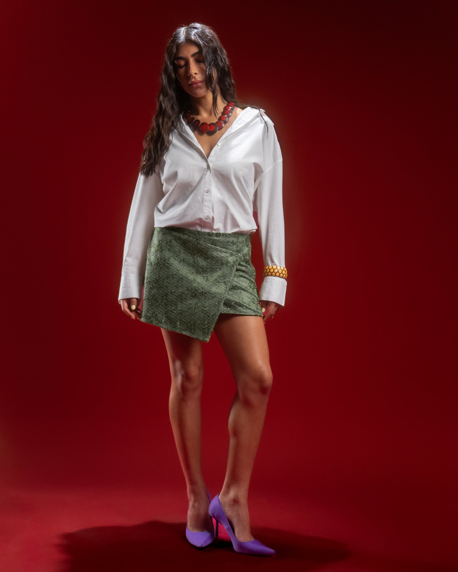 Lace layered over satin in a low-rise silhouette that balances structure and edge. An asymmetrical front panel adds definition, while the slightly generous cut through the hips offers an easy, non-restrictive fit. The skirt holds its shape but remains fluid, never rigid. Finished in muted olive green with a subtle sheen.